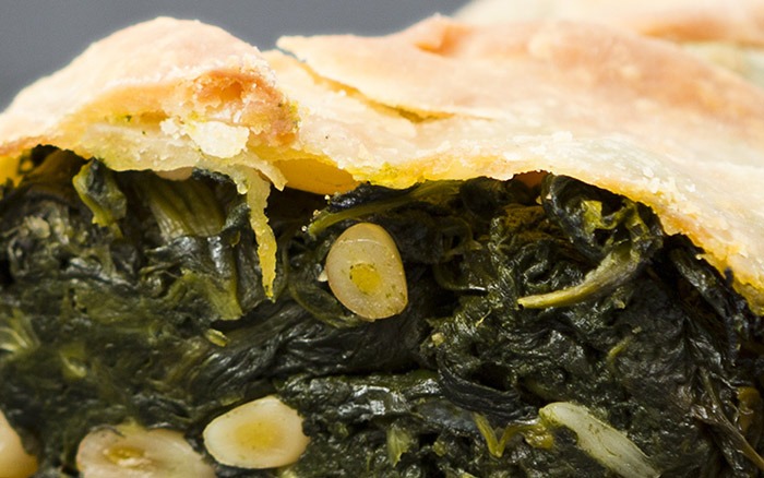 Panedón de espinacas saleadas con ajos, pasas y piñones.
